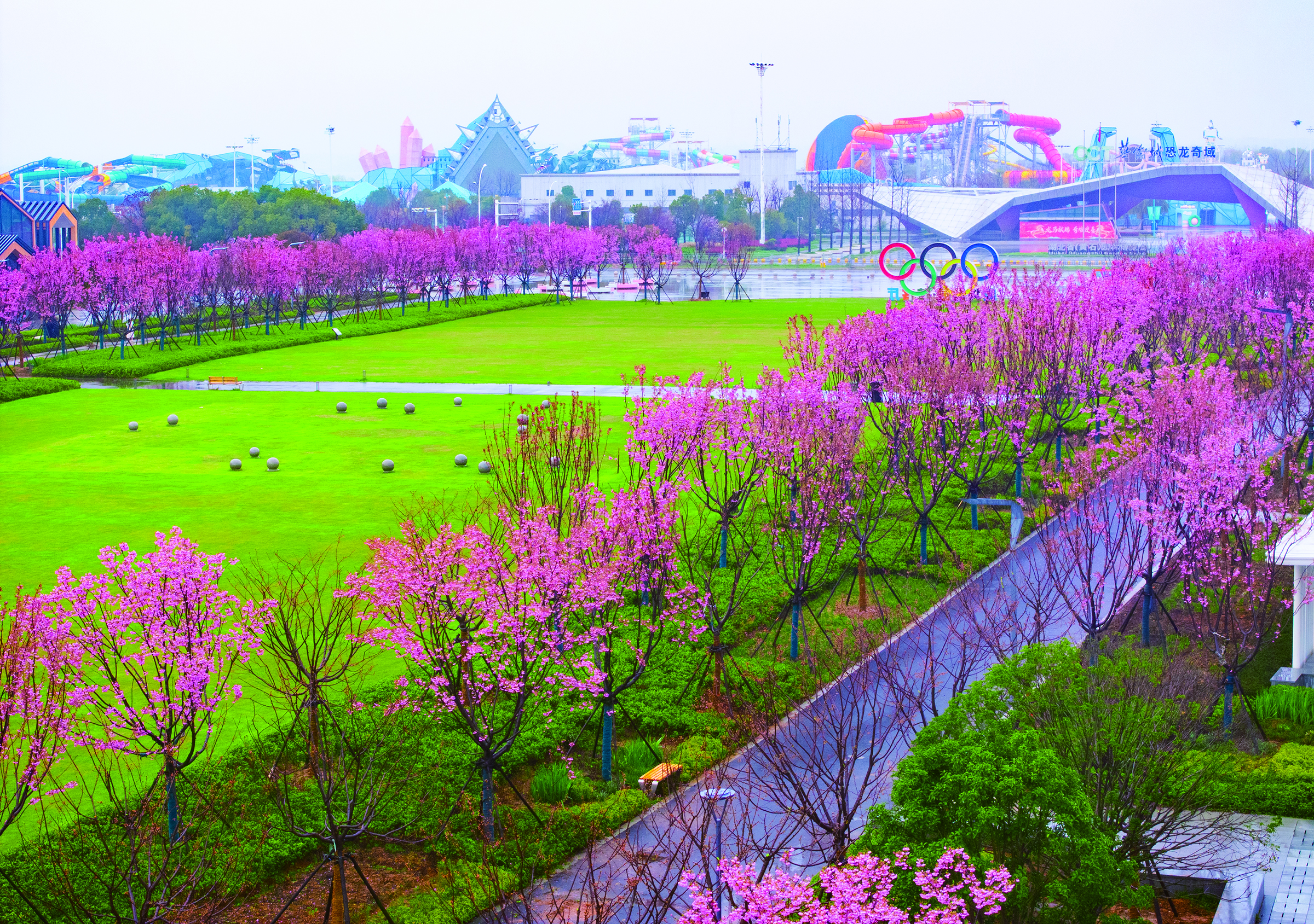 17日,陰雨天氣里,黃石奧體公園花客廳依舊春意盎然。園內(nèi)600余株高桿陽(yáng)光櫻迎來(lái)盛花期,櫻花沿草坪兩側(cè)整齊排列,勾勒出一條繁花交織的花軸景觀。 黃石融媒記者 石勇 攝