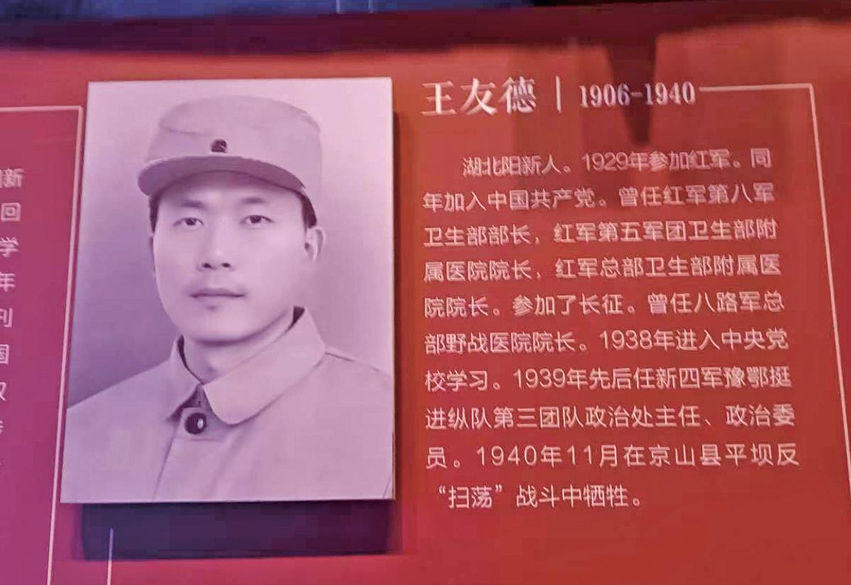 1929年,王友德從這里走上革命道路,最終在京山縣平壩反“掃蕩”戰(zhàn)斗中壯烈犧牲,年僅34歲。他的一生短暫而輝煌:曾擔(dān)任八路軍總部野戰(zhàn)醫(yī)院院長、新四軍豫鄂挺進(jìn)縱隊第三團(tuán)隊政治委員……他的一生,是醫(yī)者的仁心,更是戰(zhàn)士的赤膽。