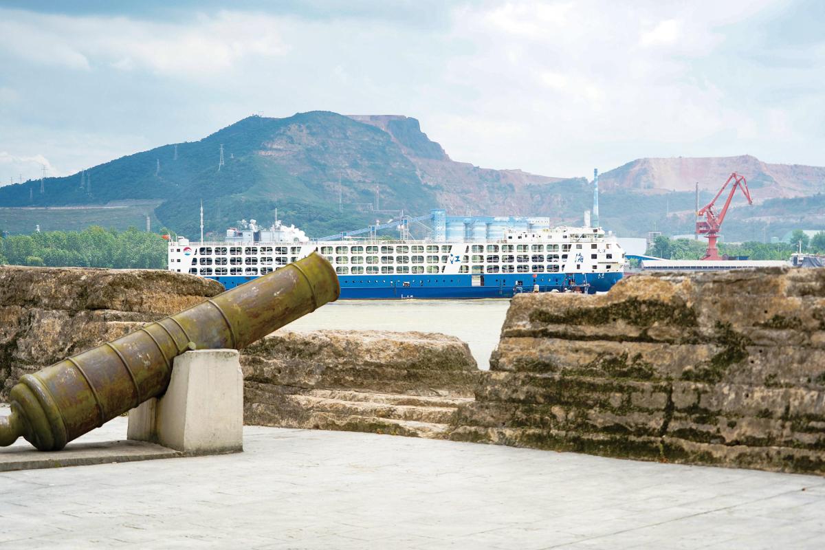 陽新縣富池鎮(zhèn)半壁山,地處長江中游,位于富河、網(wǎng)湖與長江交匯處。長江流經(jīng)此,江面陡然鎖窄,橫寬只有600米,當(dāng)?shù)鼐用裼小斑^江劃船只要18槳”的說法。