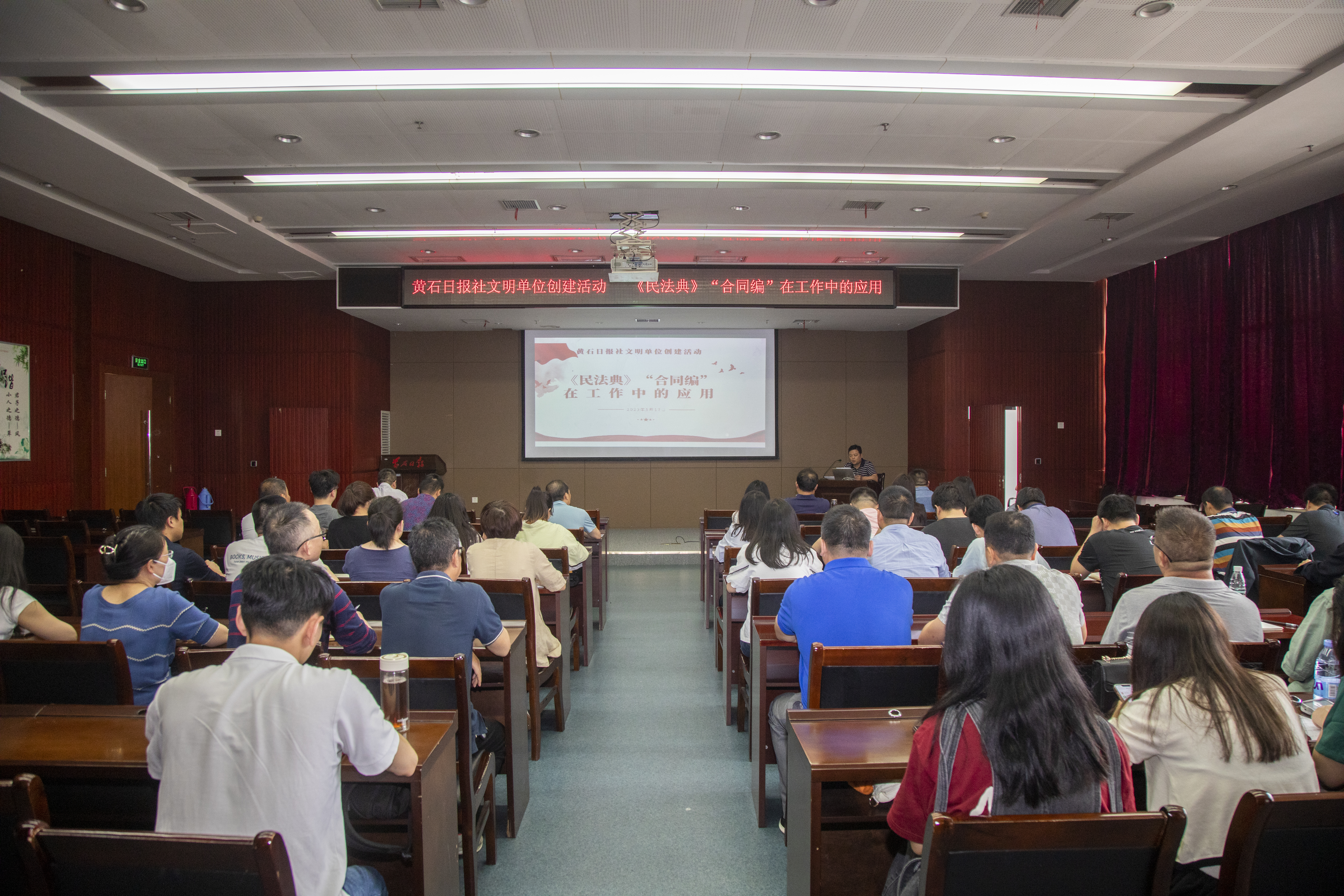 5月17日下午,為進(jìn)一步加強(qiáng)文明單位的創(chuàng)建與管理,黃石日報社在報社三樓學(xué)習(xí)報告廳開展法治宣傳及普法教育活動,報社經(jīng)營辦負(fù)責(zé)人講解了《民法典“合同編”在工作中的應(yīng)用》。報社采編部門60余名工作人員參加了學(xué)習(xí)活動。(記者?周?。?/p>