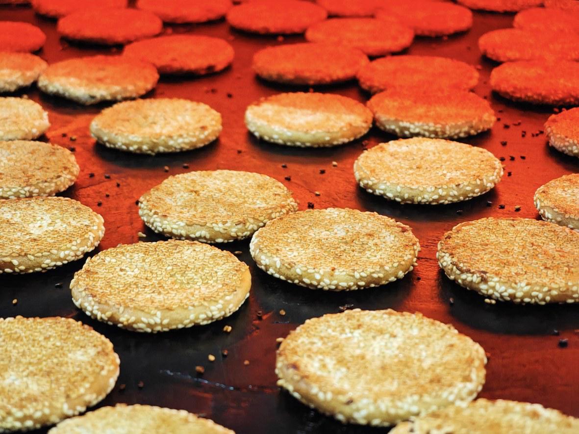 “我們的港餅生坯厚度大概5-6毫米,直徑不超過(guò)6.5厘米。經(jīng)過(guò)烘烤出爐的港餅,厚度和傳統(tǒng)的相比大概縮減了三分之一?!辟即蟮聂せ鏁r(shí)針來(lái)回?fù)u晃,里面的近百個(gè)港餅生坯在晃動(dòng)間,均勻地裹滿(mǎn)白芝麻,益朵港餅創(chuàng)始人程宏兵俯身湊上前查看生坯厚度。