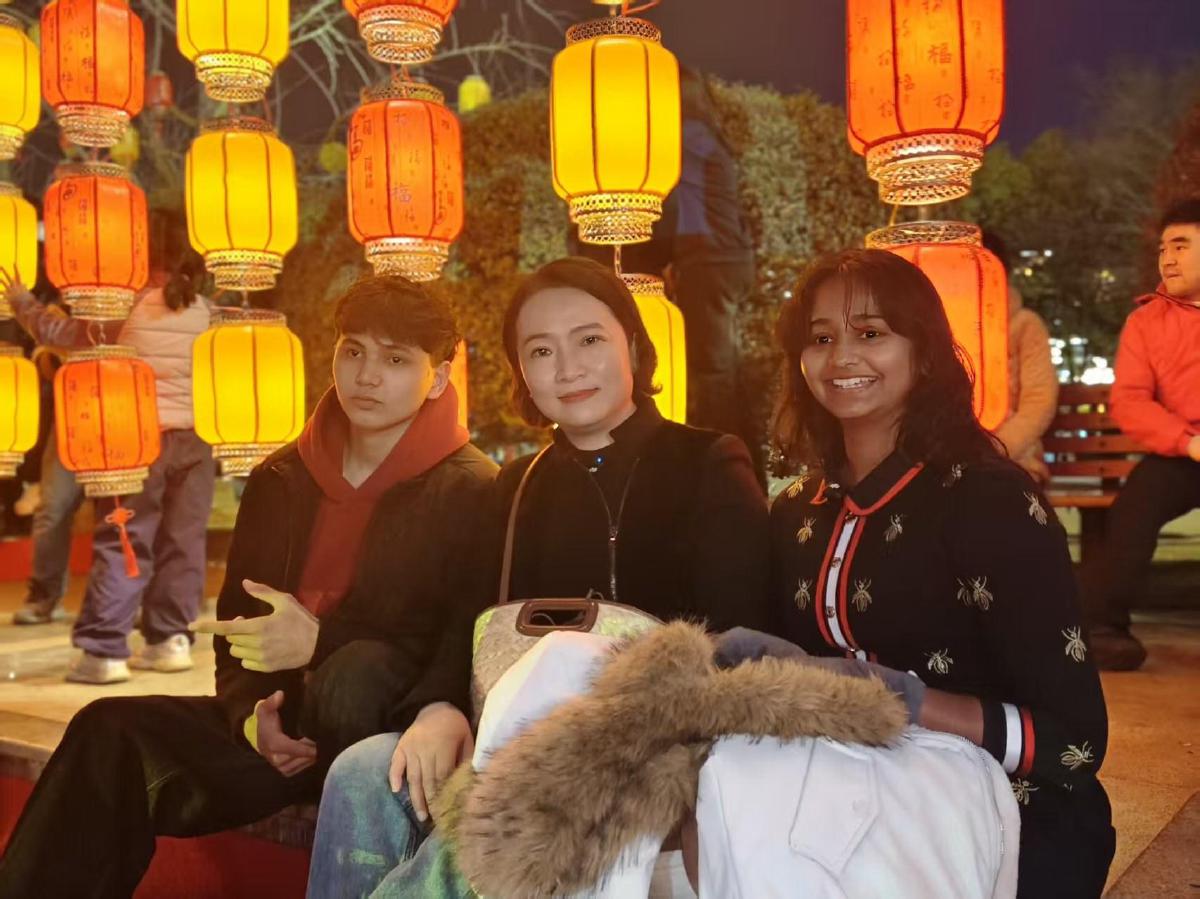 夜色漸深,漢服魚(yú)燈巡游隊(duì)伍從人群中穿行而過(guò),衣袂飄飄、燈火搖曳,宛如從古畫(huà)中走來(lái)。不遠(yuǎn)處的祈福樹(shù)下,紅綢帶掛滿枝頭,上面寫(xiě)滿了人們的新年愿望。朱軼、吳迪、方月三人穿梭在一個(gè)個(gè)活動(dòng)區(qū)域之間,盡情感受熱鬧的中國(guó)年。